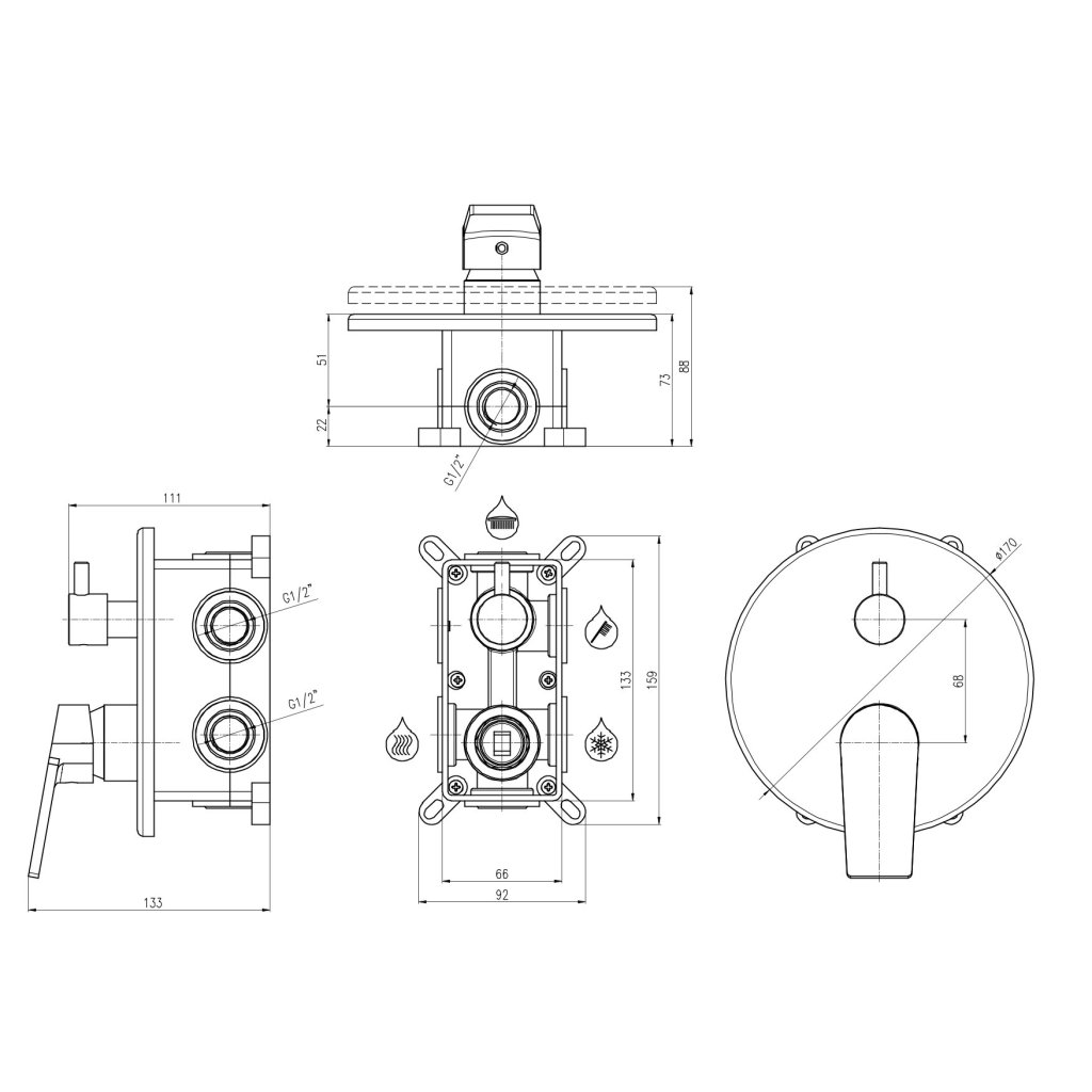 Встроенный смеситель для душа/ванны с кнопочным переключателем.