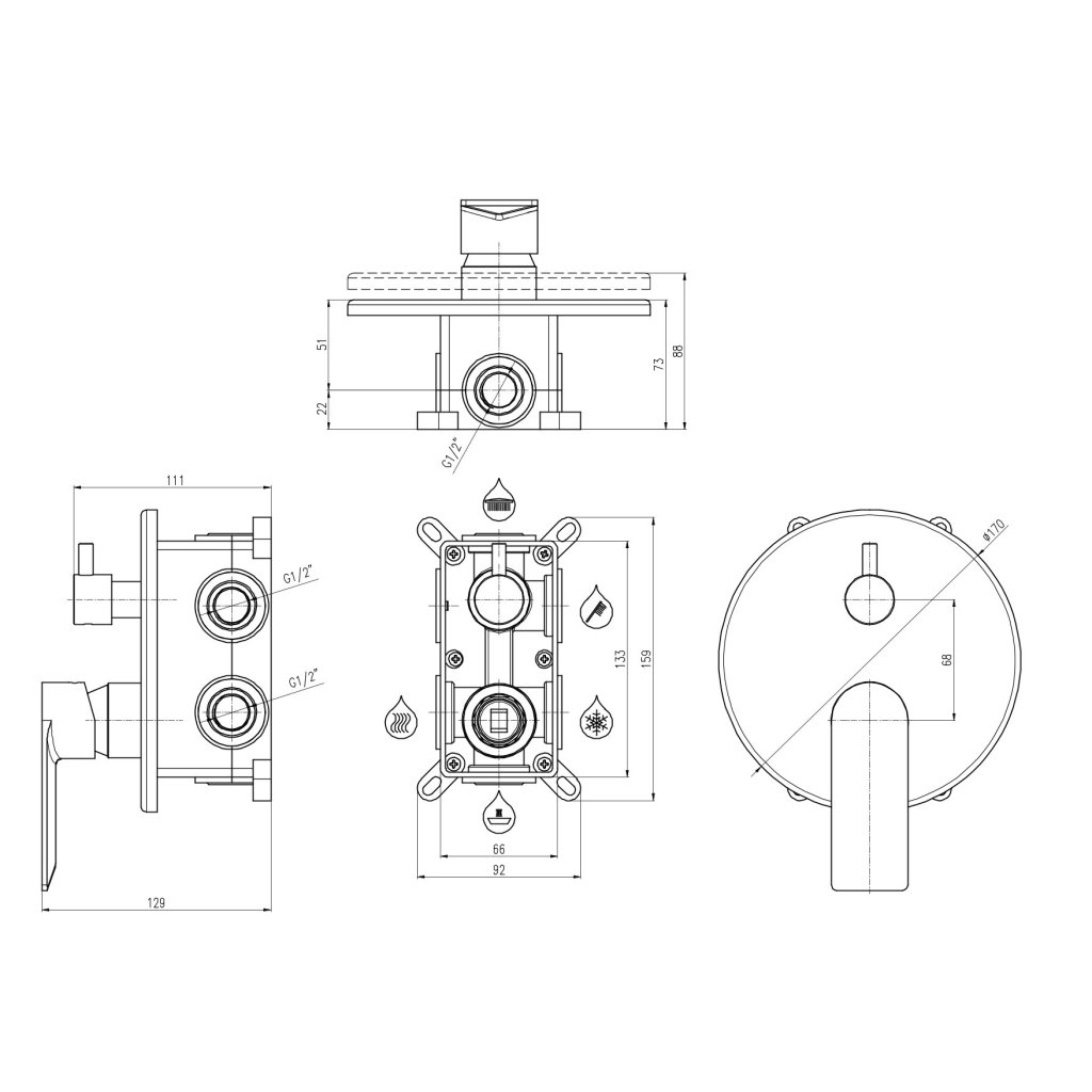 Этот смеситель можно использовать как в душевой кабине как комбинацию из трех элементов , так и в ванне как комбинацию, например, перелива, ручного душа и верхнего душа или излива, ручного душа и верхнего душа.