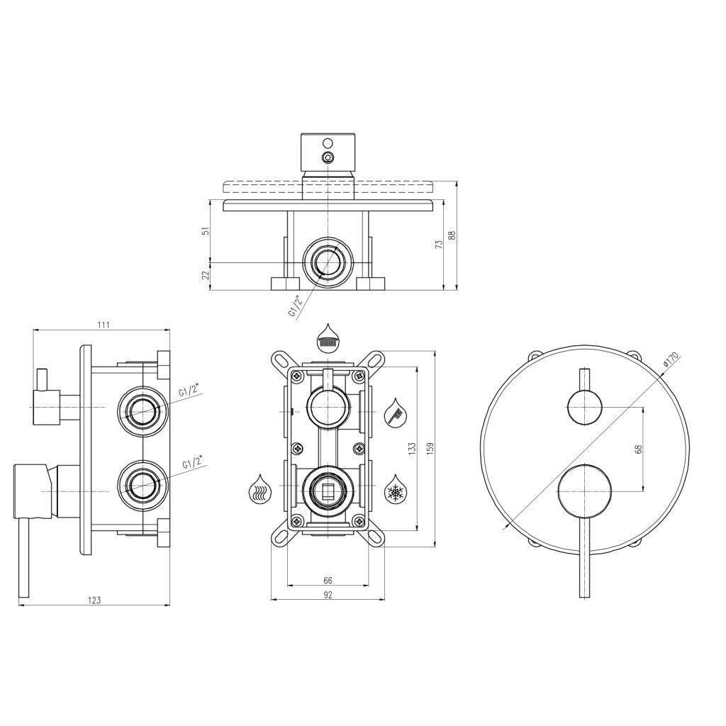 Встроенный смеситель для душа/ванны с кнопочным переключателем.
