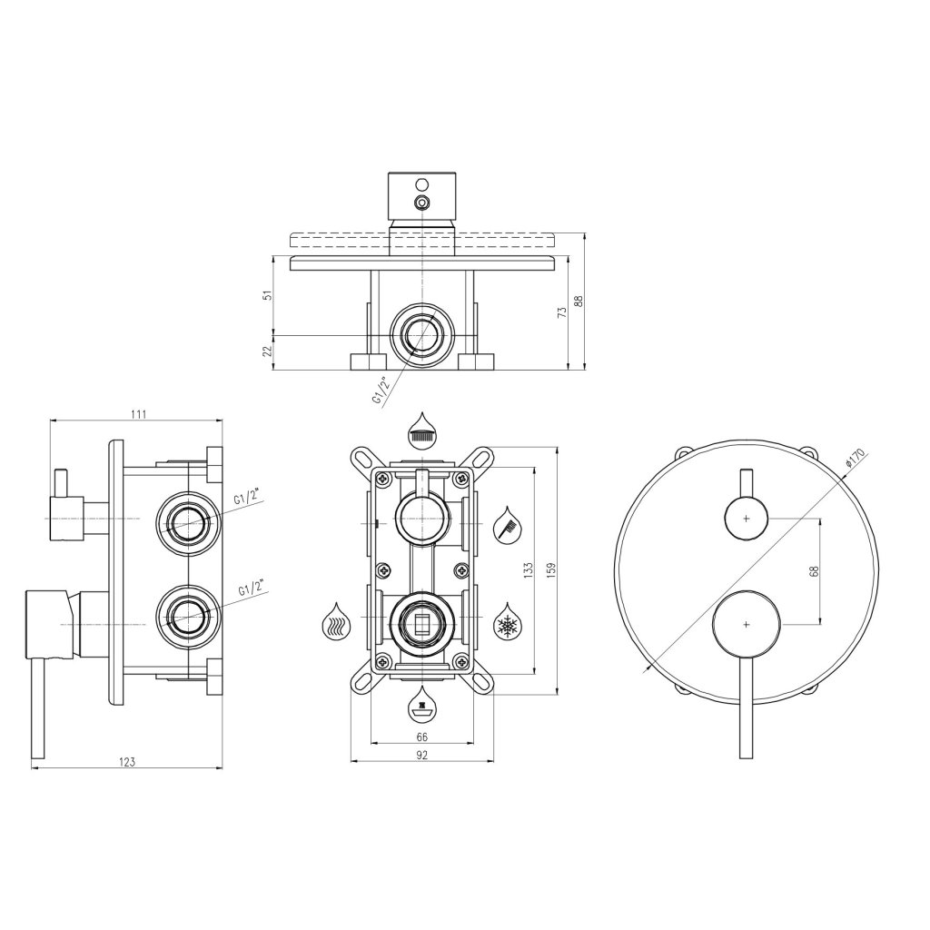 Встроенный смеситель для душа/ванны с кнопочным переключателем.