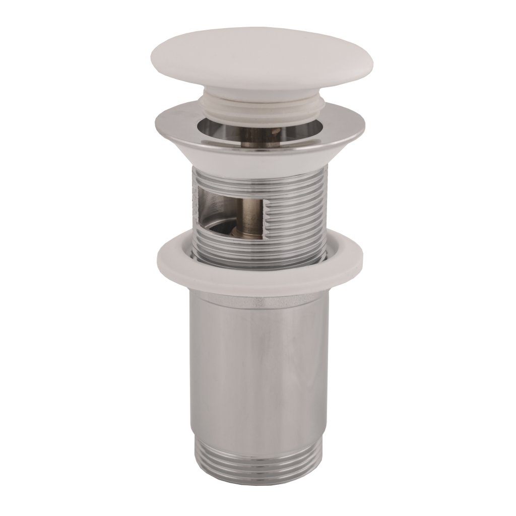 - Слив оснащен большой белой керамической пробкой и цельнометаллической гайкой.